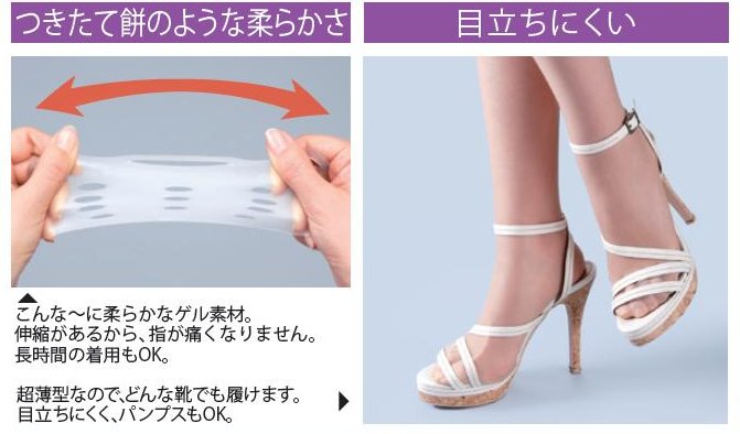 | 丸い穴に親指・中指・小指を通し、足底にフィットするように装着します。 ストッキングやソックスを履く際にめくれたり、ズレたりしないように足底 に合わせてください。 |