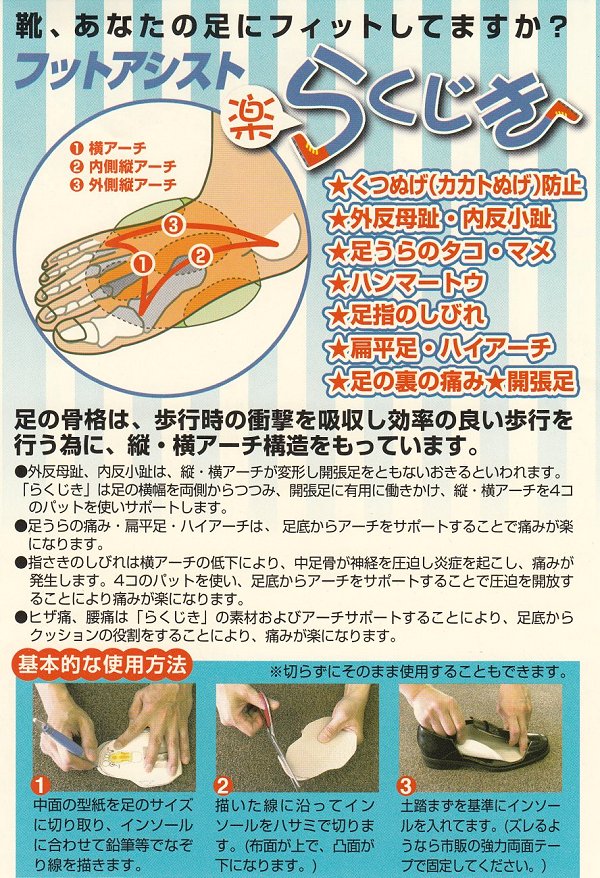 | ・外反母趾の方もらくらく・・・ ・足の裏の痛みをやわらげてらくらく・・・ ・長時間歩いてもらくらく・・・ |